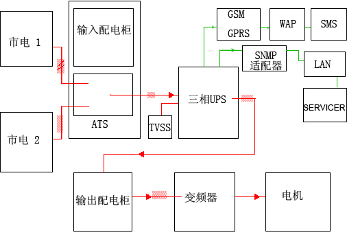 對鋼鐵企業(yè)信息中心,推薦采用UPS的雙回路冗余供電系統(tǒng),具有高度容錯的能力,可以杜絕單點故障隱患。恩億梯UPS雙回路冗余供電系統(tǒng),采用2臺三進三出大功率UPS組成1+1并聯(lián)冗余系統(tǒng)輸出,作為負載設備的主電源輸入,1路市電(也可以是另一路UPS)作為負載設備的備用電源輸入。對于雙電源負載設備,可以直接接入二路輸入,分別來自UPS并機系統(tǒng)和市電回路,提高供電保障;對于單電源負載設備,在其前端配置冗余開關,利用冗余開關的冗余配電功能提高供電可靠性——冗余開關具有二個輸入端子,一個輸出端子,只要保證有一路輸入,輸出就不會中斷。此種應用,當主回路供電系統(tǒng)供電中斷時,負載設備切換至由備用電源回路供電;從而大大提高了負載設備的供電可靠性,全面保護整個鋼鐵企業(yè)信息中心的的各種硬件設備、運行程序和數(shù)據(jù)及數(shù)據(jù)的傳輸。