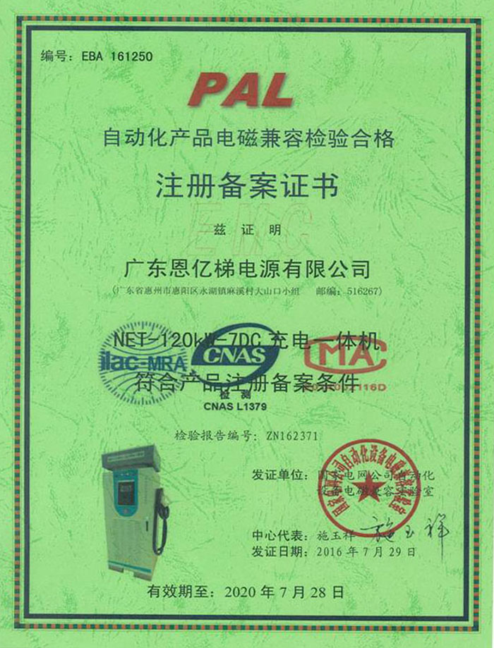 自動化產(chǎn)品電磁兼容檢驗合格注冊備案證書(充電一體機(jī))